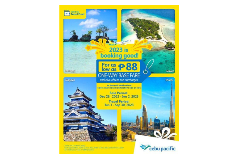 CEB will launch a special seat sale from 10AM on December 29, 2022 to January 2, 2023, domestic network for as low as PHP 88 one-way base fare. Also has the chance to fly to top international destinations for as low as PHP 499 one-way base fare. The travel period is from June 1 - September 30, 2023.
