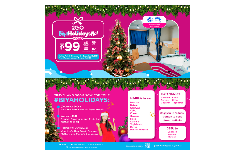 In addition to its affordable fares, 2GO Travel offers an online-exclusive booking experience available only through the 2GO app and official website. Travelers who book until the end of December 2024 can also enjoy a 15% Grab voucher for rides to and from 2GO ports in Manila, Cagayan de Oro, Iloilo, Bacolod, and Cebu, making their sea travel even more seamless and convenient.