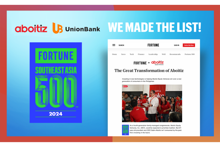 Aboitiz Equity Ventures (AEV) and Union Bank of the Philippines (UBP) have been recognized by Fortune, a global multi-platform media company, as two of the best performing companies, a testament to the Group’s transformation initiatives to become the country’s first techglomerate. On June 18, Fortune announced its newest category of business ranking, Southeast Asia 500, citing AEV among the top businesses in the region. Firms included in the list join an elite group of companies recognized under the Fortune 500 franchise.