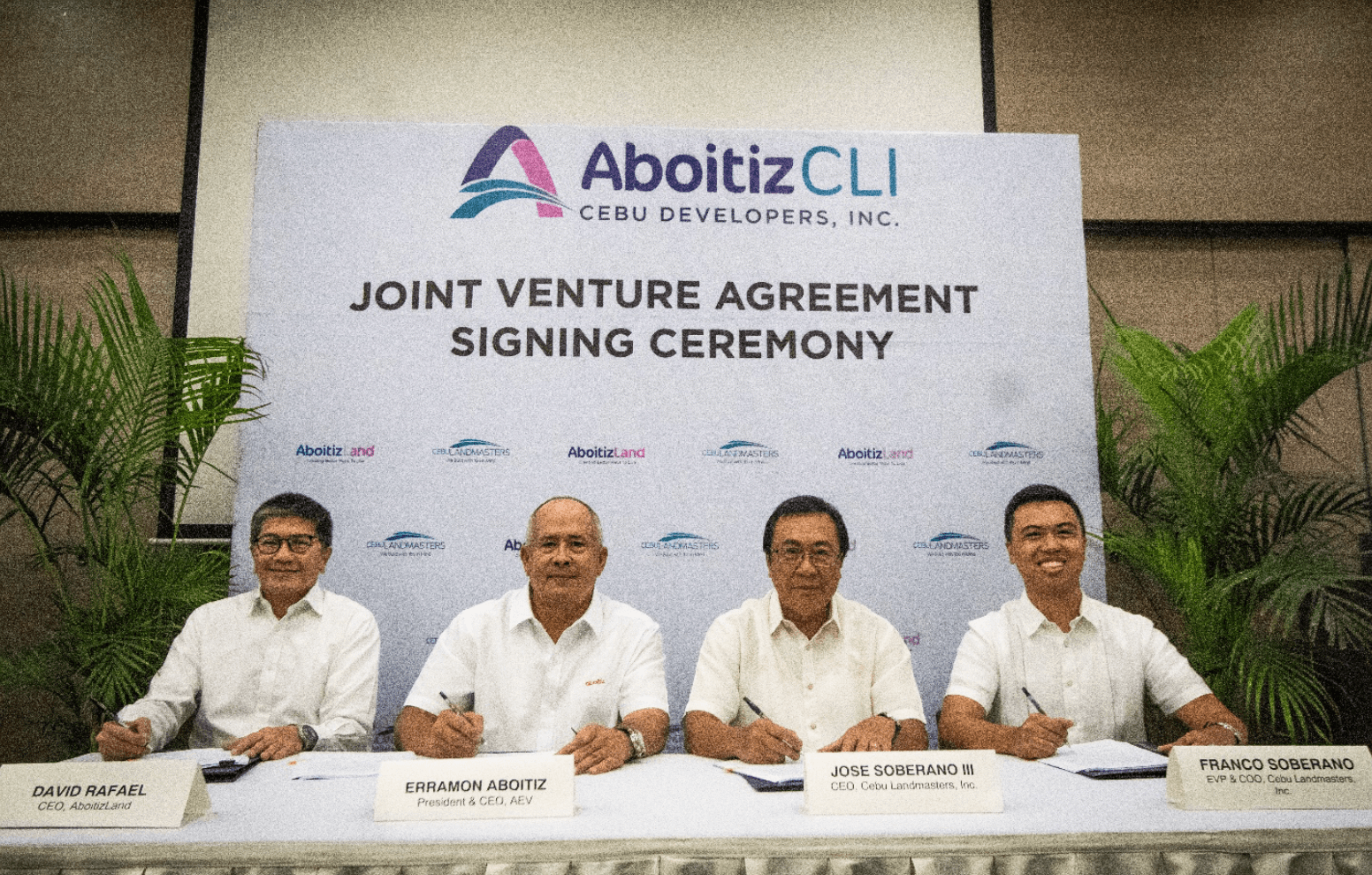 Aboitiz Land Inc. represented by CEO David Rafael and AEV president and CEO Erramon Aboitiz, together with Cebu Landmasters represented by president and CEO Jose Soberano III and EVP and COO Franco Soberano sign the contract for the joint venture company AboitizCLI Cebu Developers, Inc.