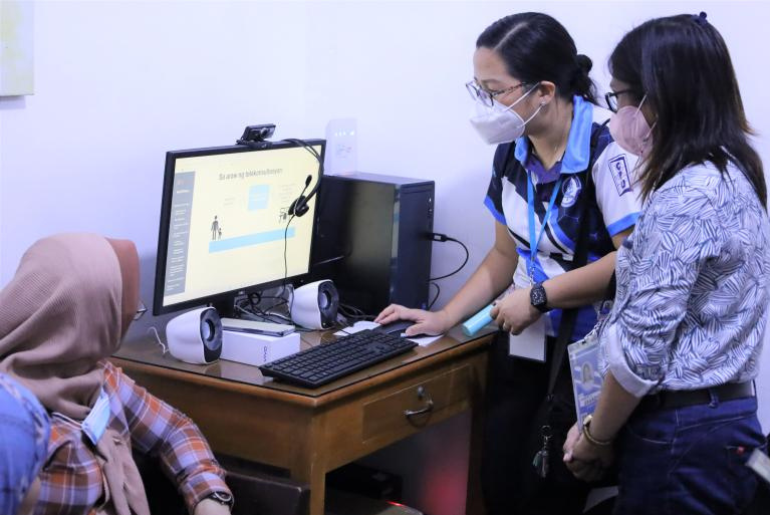 Dr Marianne Maritana of the UP-Philippine General Hospital’s Child Protection Unit, demonstrating some of the features, functionalities, and data protection and security measures of a Tele-WCPU station in Kapalong, to municipal social workers and Women and Children Protection Desk officers and responders.