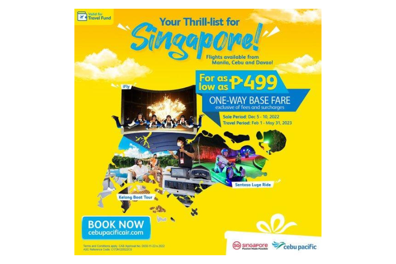 Promo fares to Singapore from Manila, Cebu, and Davao are for sale for five days, for as low as P499 one-way base fare, exclusive of fees and surcharges. The travel period for these flights are from February 1 to May 31, 2023.