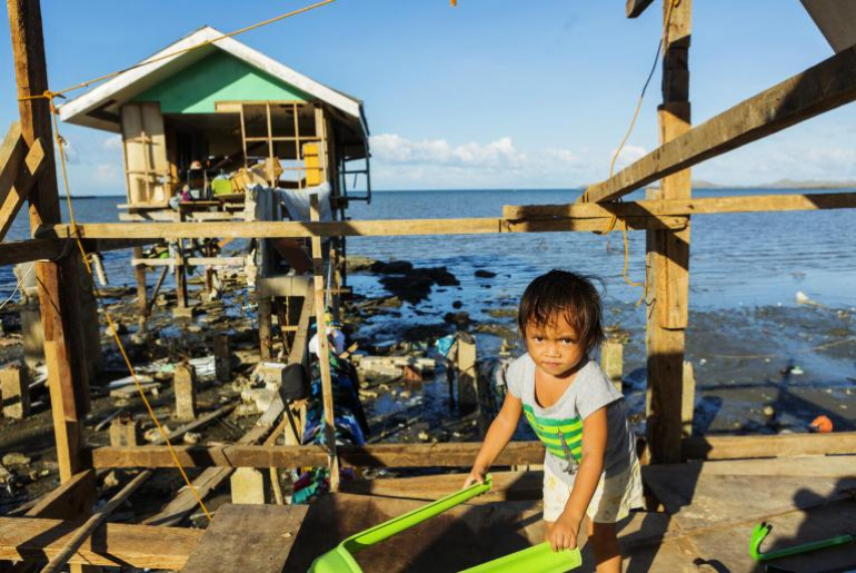 Gwendolyn, 2, stands in the house her family has already started rebuilding on 20 December 2021 in Barangay Fatima, Purok 1 in Ubay, Bohol, Philippines. Almost all of the houses near the shore in this area were completely destroyed by Typhoon Rai/Odette.