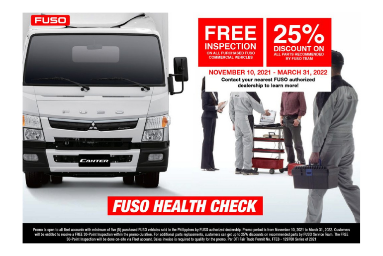 Existing accounts with a minimum of five (5) vehicles are entitled to a FREE 30-point inspection by the FUSO Service Team from your preferred FUSO dealer. In addition to the FREE inspection, a 25% discount on spare parts will also be extended.