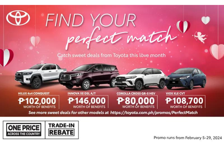 The love month is about to get lovelier with up to PHP 146,000 worth of benefits for Innova XE A/T, PHP 108,700 for Vios XLE CVT, PHP 102,000 for Hilux 4x4 Conquest A/T and PHP 80,000 for Corolla Cross GR-S HEV.