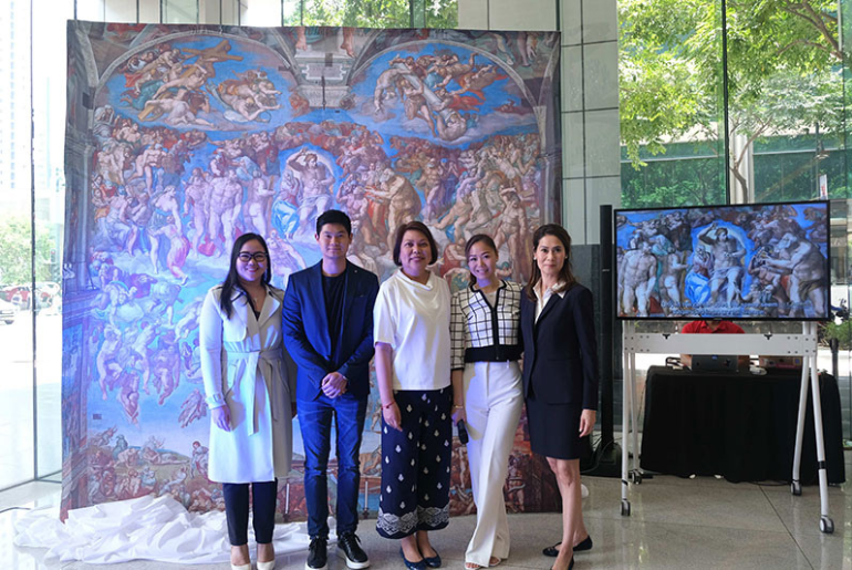 Globe executives with the Co family of ATIN Global, Inc. at the unveiling of a reproduction of Michelangelo’s “The Last Judgment” at The Globe Tower. In photo (L-R): Nico Bambao, Globe VP for People Experience; Craig Co, ATIN Global, Inc. Director; Yoly Crisanto, Globe Group Chief Sustainability and Corporate Communications Officer; Sabrina Co, ATIN Global, Inc. Founder and Creative Director; and Ruth Co, Craig Co, ATIN Global, Inc. Director.