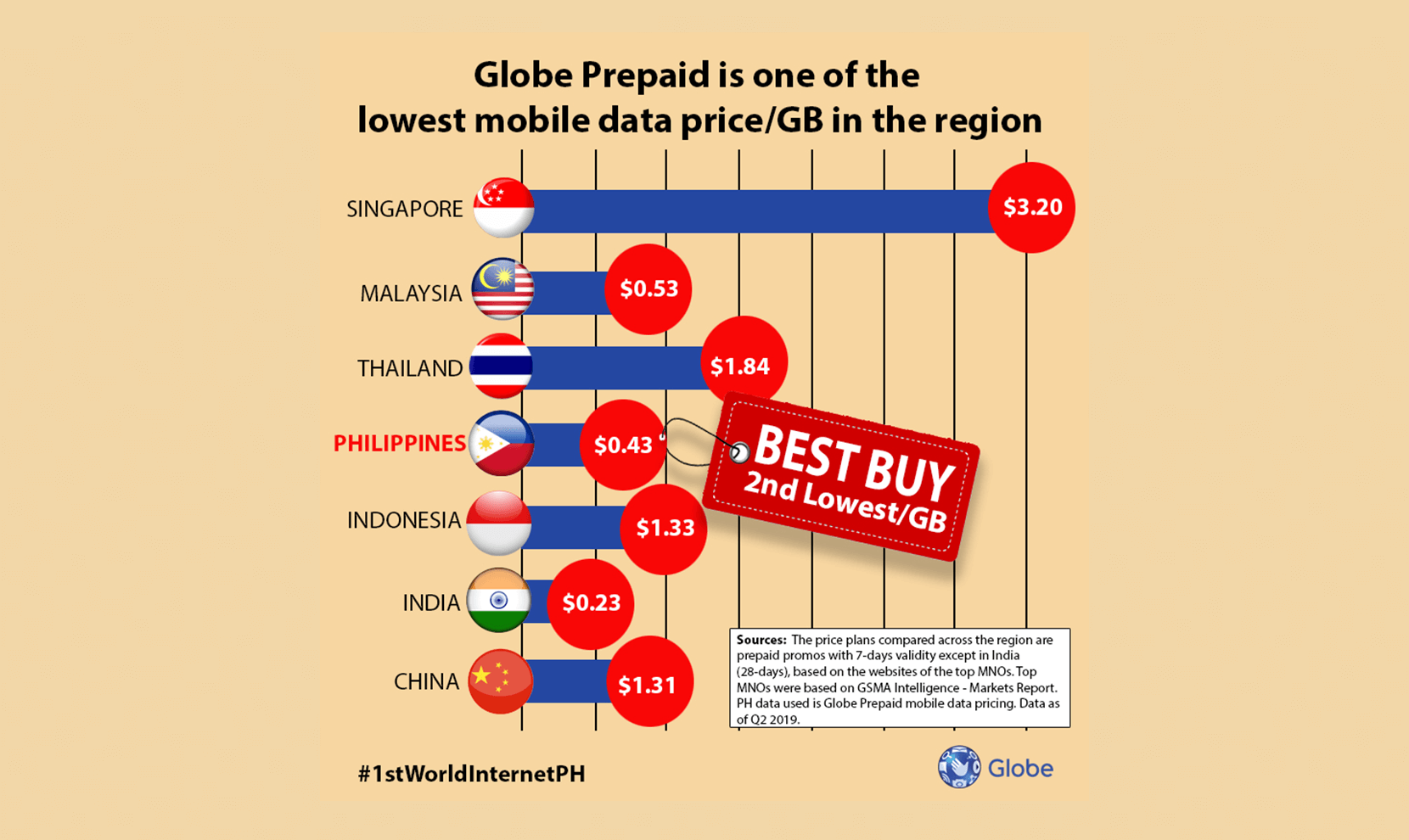 Comparing with other countries in the region, the mobile internet price per gigabyte (GB) of Globe Prepaid registered as one of the lowest in Southeast Asia and selected Asia Pacific countries including China and India.