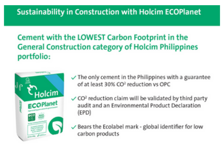 Leading building solutions provider Holcim Philippines took another significant step in helping the country’s sustainable development with the launch of Holcim ECOPlanet, its most environment-friendly product with more than 30% lower carbon footprint than other general purpose cement.