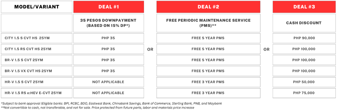The “35 Years Driving Dreams Forward” Promo will not be applied on top of existing promotions. Learn more about Honda Cars Philippines’ exclusive deals at https://www.hondaphil.com/prom.... Customers can also conveniently visit the Virtual Showroom at https://www.hondaphil.com/virt... or find the nearest dealership at https://www.hondaphil.com/deal....