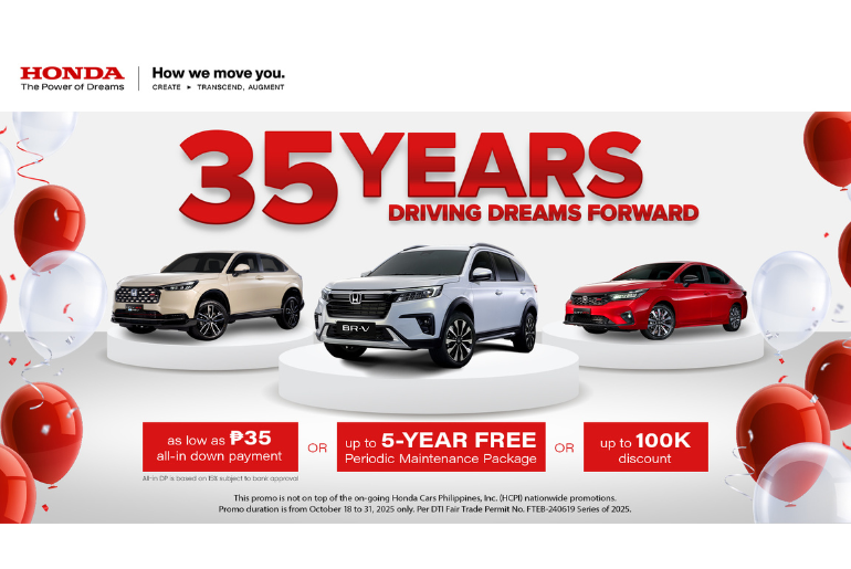 Honda Cars Philippines, Inc. (HCPI) celebrates 35 years in the country and extends the celebration to Filipinos by offering exciting anniversary deals with its “35 Years: Driving Dreams Forward” promo. From October 18-31, 2025, customers can select between a down-payment as low as PHP 35.00, availing up to 5 Years Free Periodic Maintenance Service (PMS) or as much as PHP 100,000 cash discount, when purchasing select City, BR-V or HR-V variants.