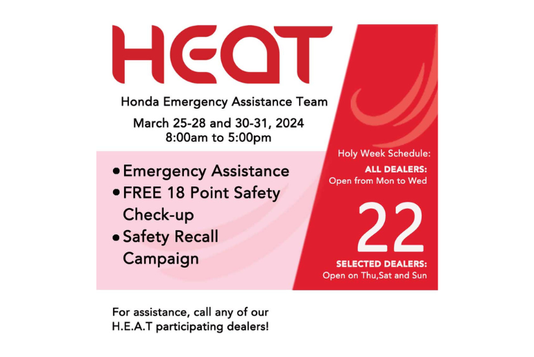 Honda Dealers will be open from Holy Monday to Holy Wednesday, the dealers that are offering HEAT this year are ready to serve you from Maundy Thursday, March 28, to Easter Sunday, March 31 - Free 18-point safety check-up, Safety Recall Campaign (SRS and fuel pump replacement), Emergency Assistance.