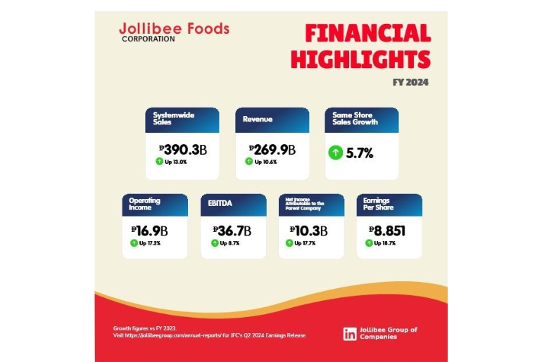 Jollibee Foods Corporation (JFC, also known as Jollibee Group), one of the largest Asian food service companies, today reported its financial results of operations for the fourth quarter (Unaudited) and full year ended December 31, 2024, based on its Audited Consolidated Financial Statements.