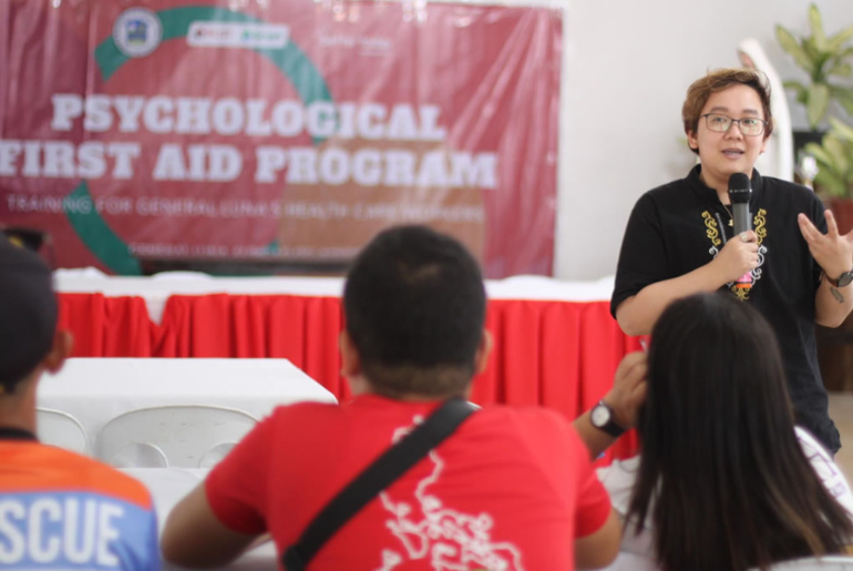 Riyan Portuguez, more popularly known as “Your Millennial Psychologist”, leads the Psychological First Aid training of the volunteer participants from General Luna, Surigao del Norte.