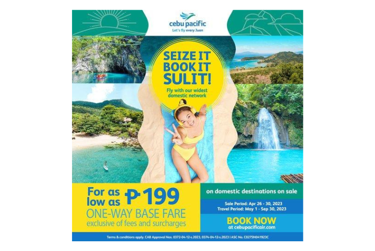From April 26 to 30, 2023, CEB travelers can book their flights across the airline’s widest domestic network for as low as PHP 199 one-way base fare, exclusive of taxes and other fees, and travel as early as May 1 until September 30, 2023.
