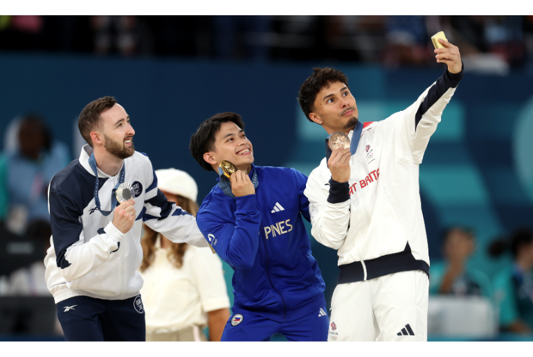 (L-R) Silver medalist Artem Dolgopyat of Team Israel, Gold medalist Carlos Edriel Yulo of Team Philippines and Bronze medalist Jake Jarman of Team Great Britain pose for a selfie on the podium during the medal ceremony for the Artistic Gymnastics Men’s Floor Exercise Final on day eight of the Olympic Games Paris 2024 at Bercy Arena on August 03, 2024 in Paris, France. (Photo by Julian Finney/Getty Images)