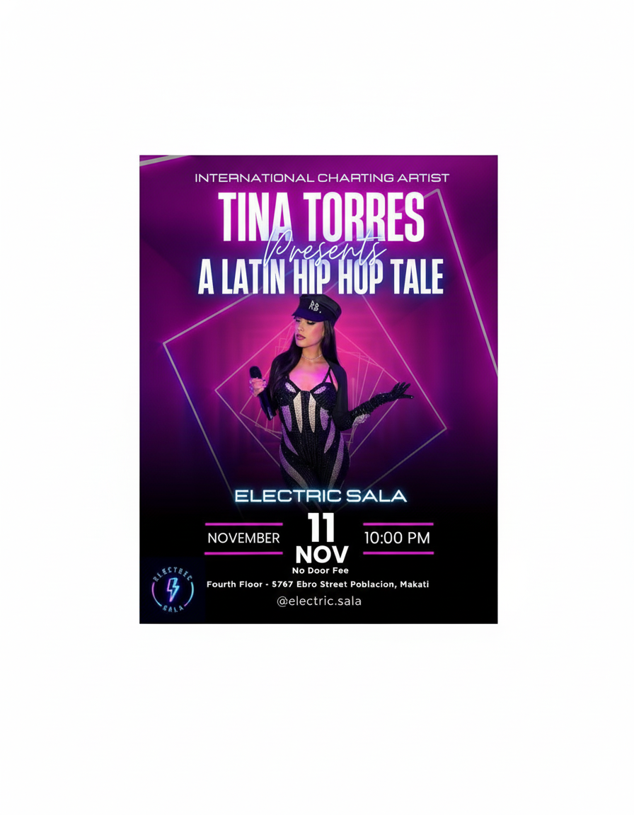 Global music sensation Tina Torres brings her Latin-infused sound to “A Latin Hip Hop Tale” at Electric Sala, 5767 Ebro St., Poblacion, Makati, on November 11 at 10 PM. Experience a world-class, high-energy night of rhythm and culture — with free entry for all.