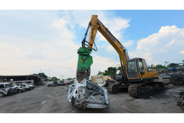 An excavator fitted with a hydraulic shear attachment dismantles an end-of-life vehicle at Standard Insurance's ELV (End-of-Life Vehicle) dismantling facility