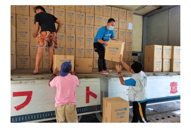 UNICEF staff and logistics support personnel load hygiene and dignity kits and other WASH supplies onto a truck from the UNICEF warehouse in Mindanao. This is the first shipment of emergency supplies to be sent to areas affected by Typhoon Odette/Rai, to support the Government's emergency response.