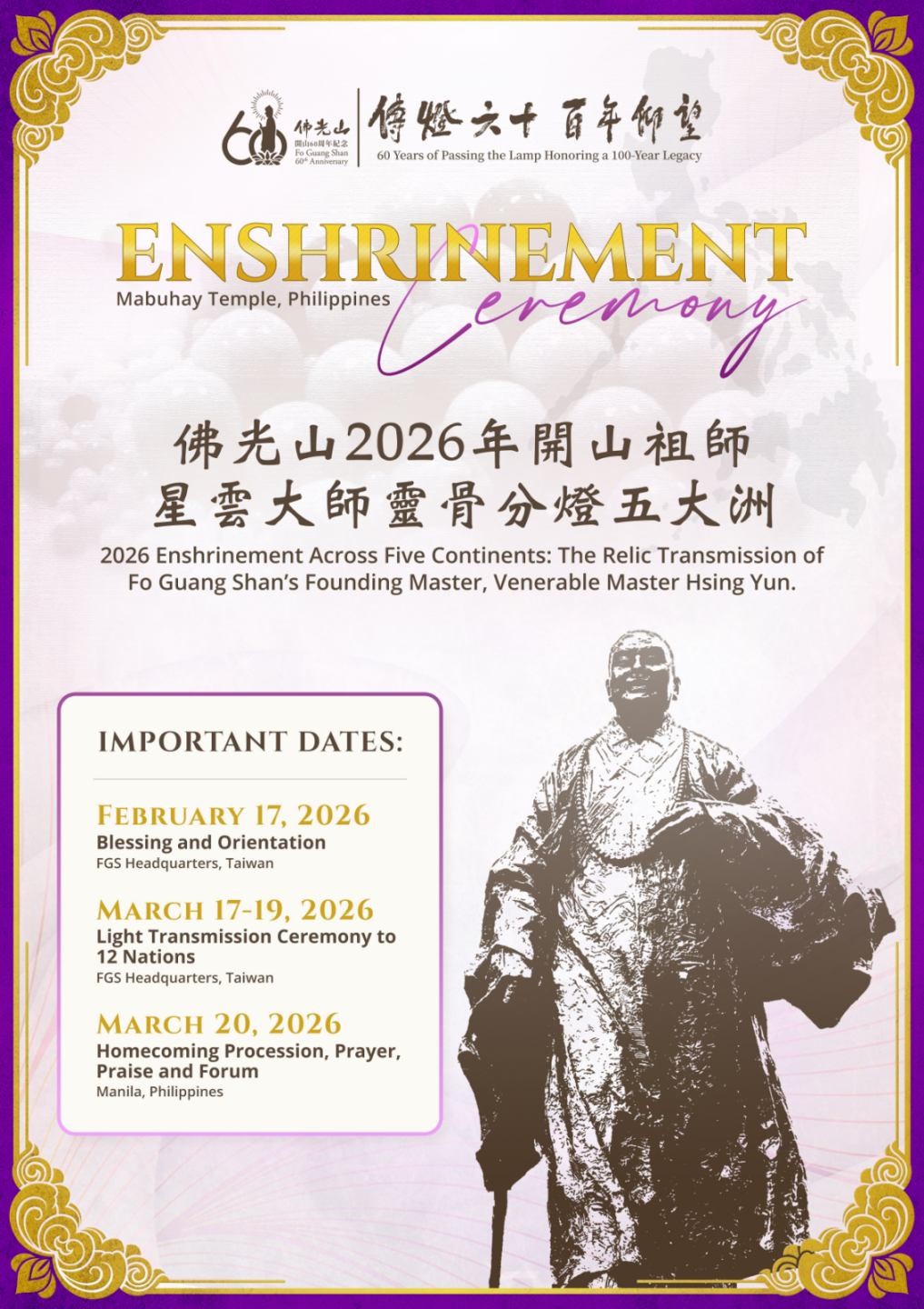 The sacred relics of Venerable Master Hsing Yun were permanently enshrined at Manila’s Mabuhay Temple today. This historic event honors his transformative legacy in the Philippines, from the Three Acts of Goodness to the growth of Guang Ming College, fostering a future of education and harmony.