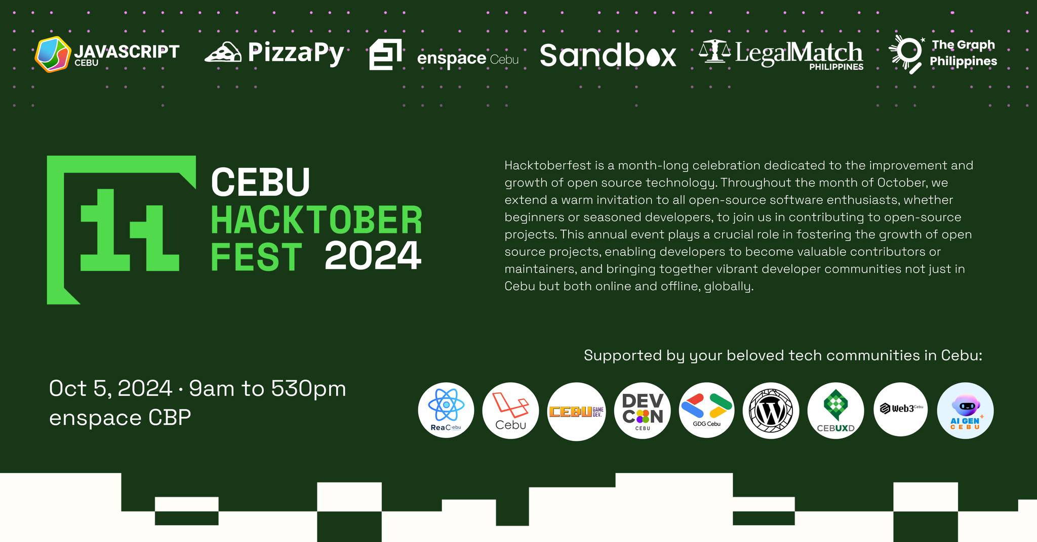 Cebu City - September 28, 2024 - Cebu City, Philippines – On October 5, 2024, Cebu will play host to an exciting opening day of Hacktoberfest 2024 at enspace Cebu, a month-long global celebration of open-source software development. Organized by JavaScript Cebu and PizzaPy Cebu Python Users Group, this local edition of the international event promises to bring together tech enthusiasts, developers, and innovators from the region.