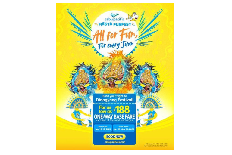Iloilo's Dinagyang Festival with a special Fiesta FunFest Seat Sale from Jan 16-19, allowing everyJuan to fly to Iloilo & experience the festival’s comeback. For as low as PHP 188, one-way base fare, exclusive of fees & surcharges. The travel period for this seat sale is from Jan 16 - May 31, 2023.