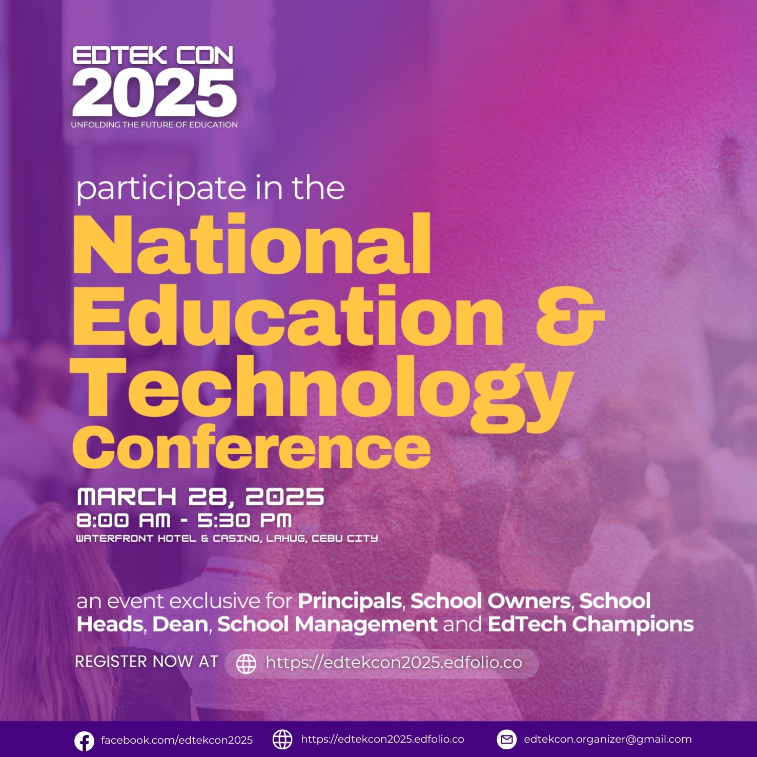 THE first edition of the National Education & Technology Conference (EdTek Con) 2025, titled “Unfolding the future of education,” will be held at Waterfront Cebu City Hotel & Casino in Lahug on Friday, March 28, 2025 from 8 a.m. to 5:30 p.m.; mainly organized by EdFolio, an EdTech start-up from Ilig