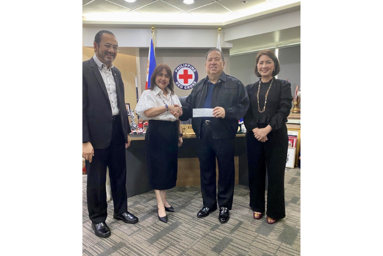 SMFI’s Connie Angeles (second from left) hands the donation to PRC chairperson Dick Gordon (third from left). Joining the turnover are PRC Governor Ernesto Isla and PRC Secretary General Dr. Gwen Pang (first and fourth from left, respectively). Photo from PRC.