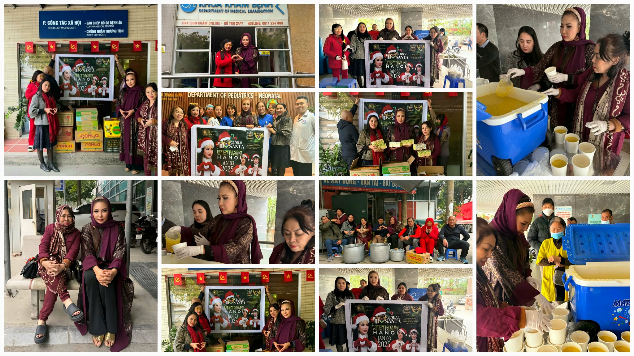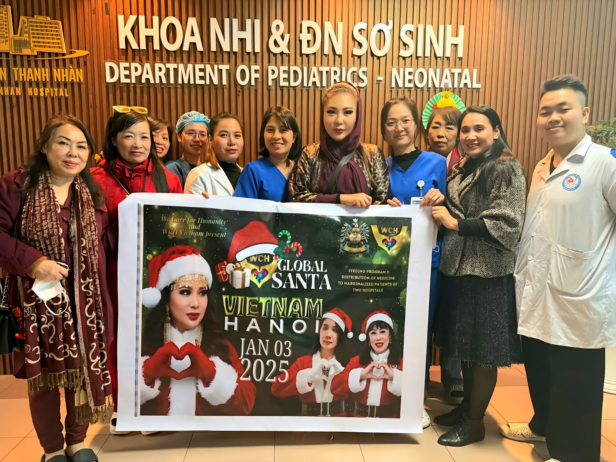 The Global Santa initiative landed in Hanoi as Queen Maria joined WCH Vietnam leaders to distribute food and medicine at two cancer hospitals. Major sponsor Ms. Thuy Tran, a WCH Woman of the Year, was pivotal in delivering this aid to hundreds of patients battling critical illness.
